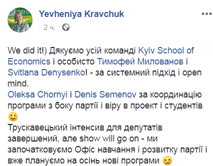 В посте Кравчук поблагодарила команду Киевской школы экономики, которая готовила интенсивный недельный курс обучения для будущих нардепов от партии "Слуга народа".
