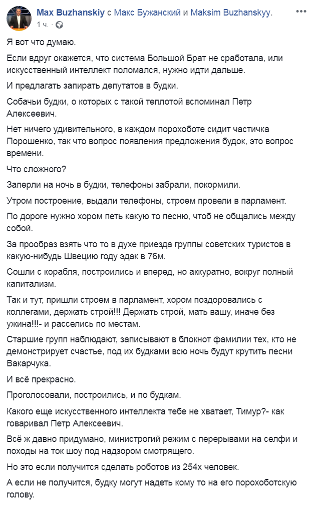 "Что сложного? Заперли на ночь в будки, телефоны забрали, покормили. Утром построение, выдали телефоны, строем провели в парламент. По дороге нужно хором петь какую то песню, чтоб не общались между собой... Проголосовали, построились, и по будкам", - написал Бужанский.