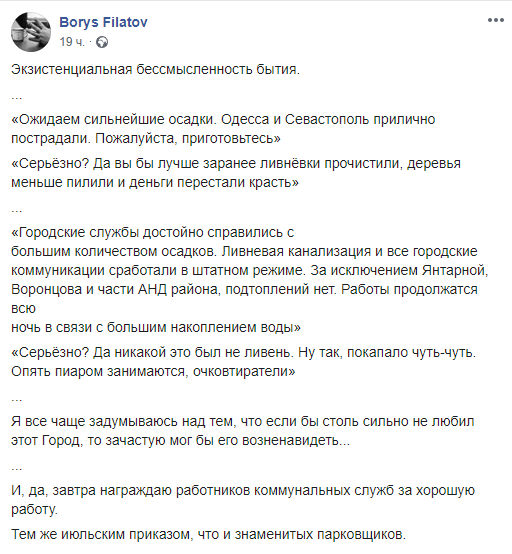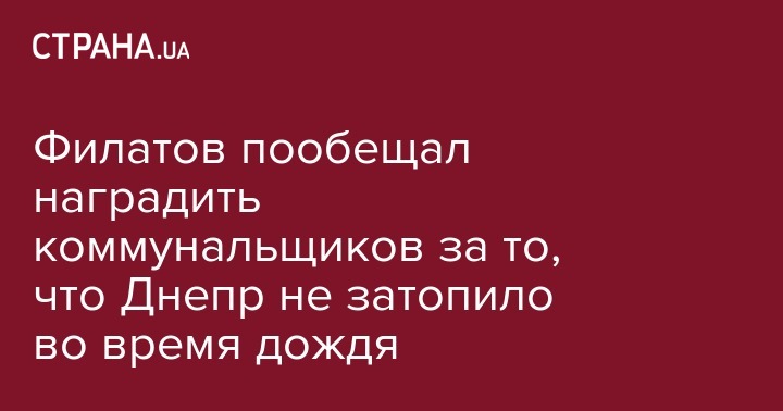 После затяжного дождя, который накрыл Днепр в минувшее воскресенье, 4 августа, мэр Борис Филатов решил наградить коммунальщиков за то, что город не затопило. В субботу власти Днепра предупредили о надвигающейся стихии и обещали жителям Днепра стихию с порывами ветра, поваленными деревьями и пятимесячной нормой осадков. В итоге обещанного "апокалипсиса" не случилось - все свелось к длительному дождю. Однако городские власти считают, что Днепр "не превратился в болото" исключительно благодаря стараниям коммунальных служб. Об этом городской голова Борис Филатов на писал на своей странице в соцсети.