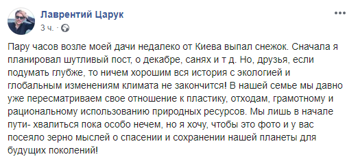 По словам автора поста, снег выпал около полудня возле его дачи недалеко от Киева (в направлении Житомира. "Пару часов возле моей дачи недалеко от Киева выпал снежок. Сначала я планировал шутливый пост, о декабре, санях и т д. Но, друзья, если подумать глубже, то ничем хорошим вся история с экологией и глобальным изменениям климата не закончится", - подписал Лаврентий Царук опубликованное фото.