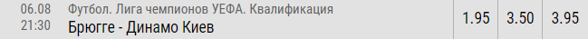Сегодня, 6 августа, футболисты киевского Динамо проведут на выезде свой первый матч третьего отборочного раунда Лиги чемпионов. Соперником нашей команды будет бельгийский Брюгге. И букмекеры уже определились с фаворитом этого поединка.