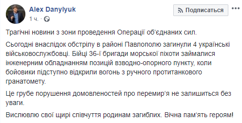 "Сегодня в результате обстрела в районе Павлополь погибли 4 украинских военнослужащих. Бойцы 36-й бригады морской пехоты занимались инженерным оборудованием позиций взводный-опорного пункта, когда боевики коварно открыли огонь из ручного противотанкового гранатомета. Это грубое нарушение договоренностей о перемирии не останется без внимания", - написал в соцсети Данилюк.