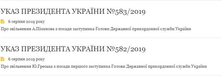 Другим своим указом (№583/2019 от 6 августа), обнародованном на сайте президента вслед за предыдущим, Зеленский уволил Пименова с должности заместителя руководителя Госпогранслужбы Украины.