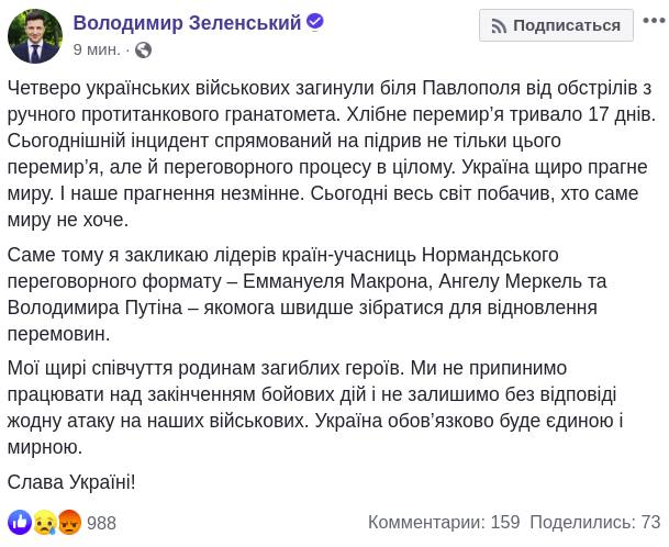 Отдельно Зеленский написал пост в Facebook, в котором призвал Меркель, Макрона и Путина "как можно скорее восстановить переговоры". И анонсировал свой звонок канцлеру Германии и президенту Франции.