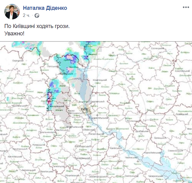 Украинский синоптик Наталья Диденко предупредила киевлян о грозовом фронте, который приближается к столице. Предупреждение она опубликовала на своей странице в соцсети.
