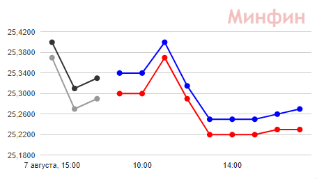 В 15:00 курс подешевел еще больше: 25,22 - покупка и 25,25 - продажа.