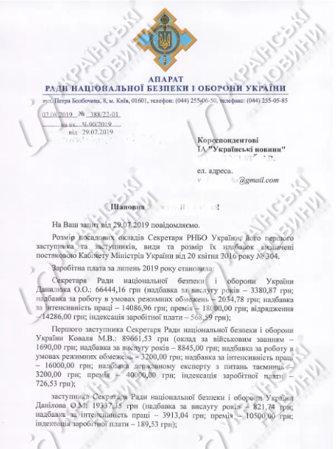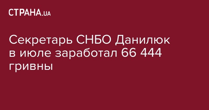 "Заработная плата секретаря СНБО Александра Данилюка за июль 2019 года составила 66 444 гривны", - говорится в документе.