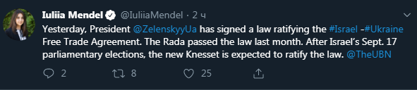 "Вчера президент Владимир Зеленский подписал закон о ратификации соглашения о свободной торговле с Израилем. Рада приняла закон в прошлом месяце. После парламентских выборов в Израиле 17 сентября ожидается, что новый Кнессет ратифицирует закон", - написала Мендель.