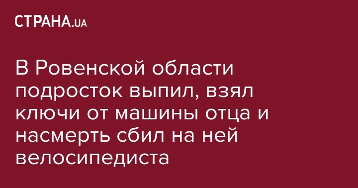 Вечером в среду, 7 августа, в Ровенской области легковое авто Skoda Oktavia насмерть сбило 34-летнего велосипедиста. За рулем машины был 15-летний подросток, который к тому же оказался пьян. Машину он взял у отца покататься.