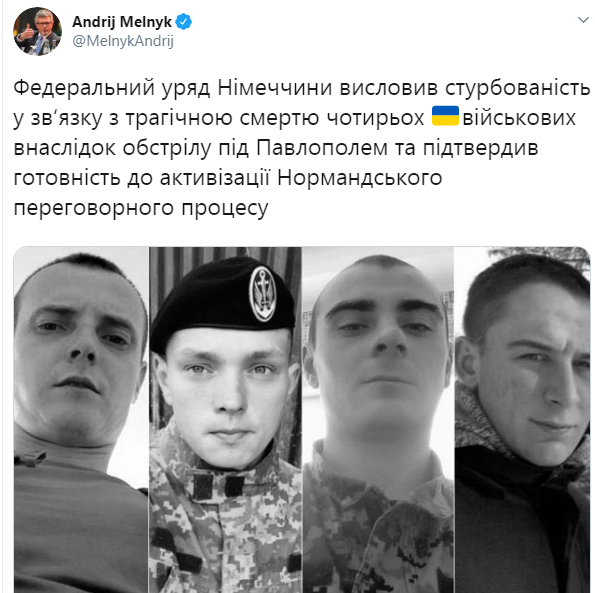 "Федеральное правительство Германии выразило обеспокоенность в связи с трагической смертью четырех военных в результате обстрела под Павлополем и подтвердил готовность к активизации нормандского переговорного процесса", - сообщил Мельник в Twitter.