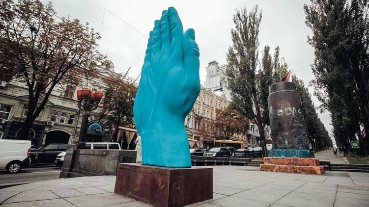 Временный арт-объект был представлен в виде гигантской руки синего цвета. Как пояснили в киевской мэрии, рука, которая одновременно является и левой, и правой, символизирует дружбу и единство.