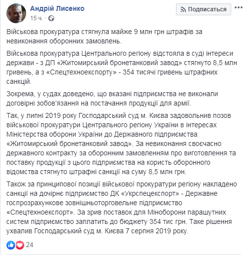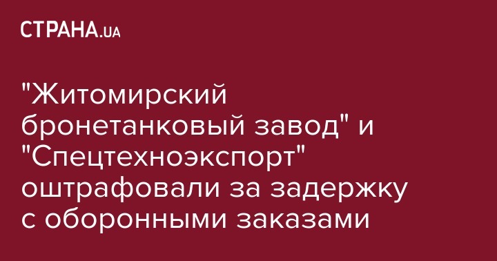 В июле 2019 года в Хозяйственном суде Киева обязали "Житомирский бронетанковый завод" уплатить штраф в размере 8,5 млн грн из-за того, что на предприятии не своевременно выполнили госконтракт по оборонному заказу.