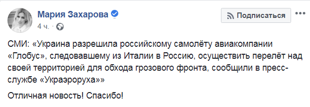 "СМИ: "Украина разрешила российскому самолёту авиакомпании "Глобус", следовавшему из Италии в Россию, осуществить перелёт над своей территорией для обхода грозового фронта, сообщили в пресс-службе "Украэроруха". Отличная новость! Спасибо!" - написала представитель российского МИД.