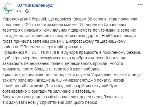 "Работники КП УЗН та КП ЛПГ со вчерашнего дня (8 августа - Ред.) работают в усиленном режиме, чтобы в первую очередь распиливать и убрать деревья и ветки, мешающие передвижению людей, перекрывающие проезды. Работы продолжаются, однако большинство территорий уже убрано", - говорится в опубликованном сообщении.