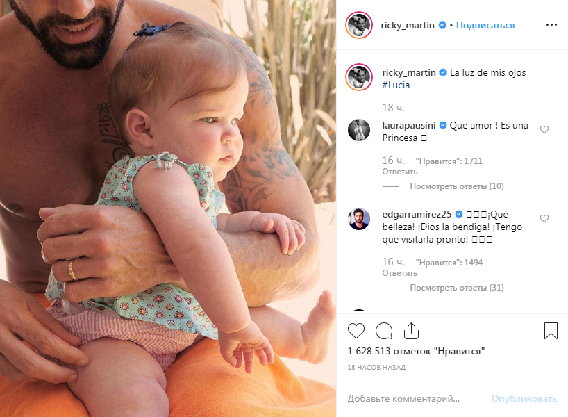 Поп-певец Рики Мартин, который в прошлом году женился на своем парне, шведском художнике сирийского происхождения Джоэне Юзефе, впервые показал их с супругом 11-месячную дочь. Ее снимок он выложил в Instagram.