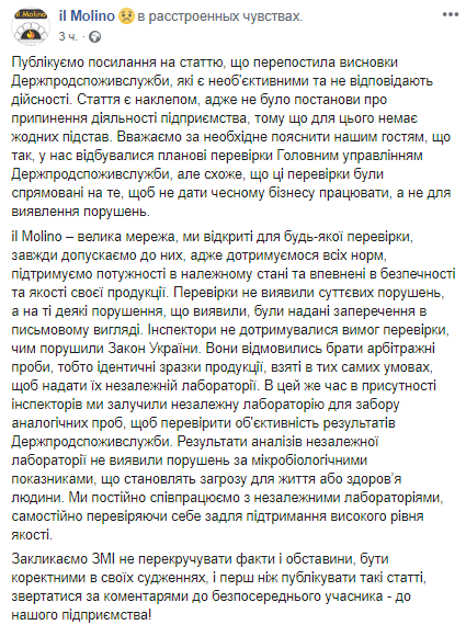 И несмотря на то, что по данным Госпродпотребслужбы, главным государственным инспектором Киева было принято решение о временном прекращении деятельности по производству и обороту пищевых продуктов этой сетью заведений, в іl Molino сообщили, что постановления о прекращении деятельности предприятия не было, потому что оснований для этого нет.