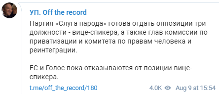 По данным Тelegram канала УП. Off the record, партия Слуга народа готова отдать должность вице-спикера парламента представителю оппозиции.