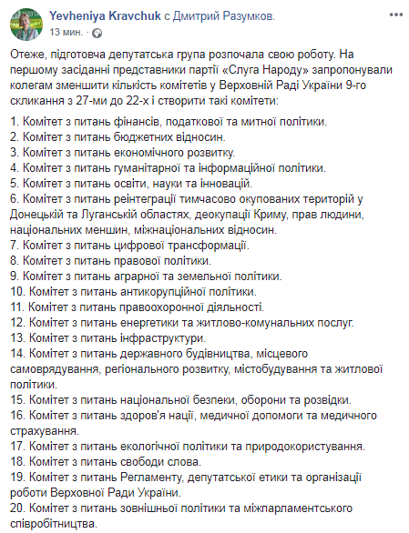 Претендентка на пост одного из 15 заместителей председателя фракции "Слуги народа" Евгения Кравчук сообщила, какие 22 парламентских комитета политсила предлагает сформировать в Верховной Раде 9-го созыва. Об этом она написала в Facebook.