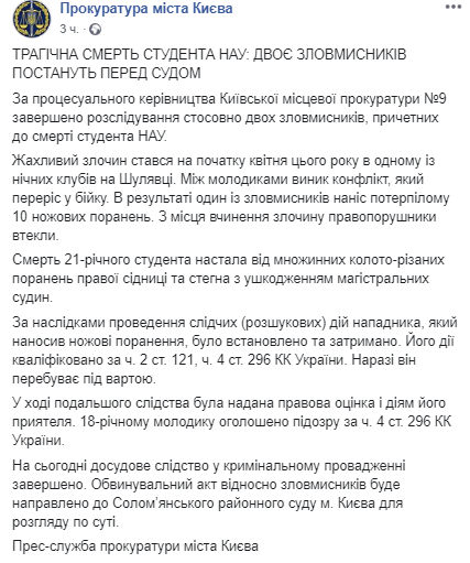 Прокуратура Киева завершила следствие по делу о жестоком убийстве в ночном клубе.