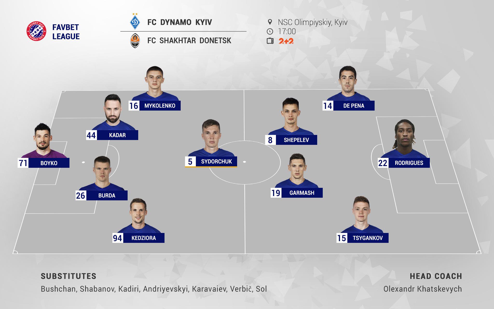Динамо: Бойко – защитники Кендзера, Бурда, Кадар, Миколенко – полузащитники Гармаш, Сидорчук, Шепелев – нападающие Цыганков, Родригес, Де Пена.