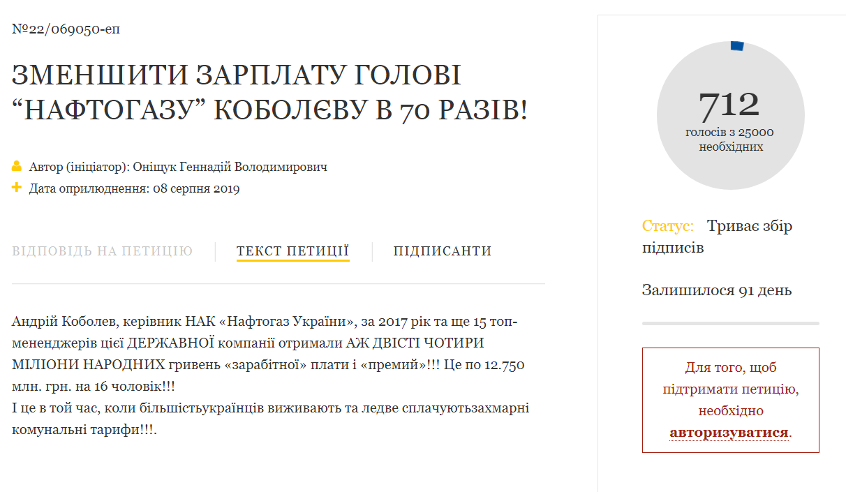 Президента Украины Владимира Зеленского призвали существенно уменьшить огромную зарплату председателя правления НАК "Нафтогаз Украины" Андрея Коболева. Соответствующая петиция была зарегистрирована на сайте главы государства 8 августа.