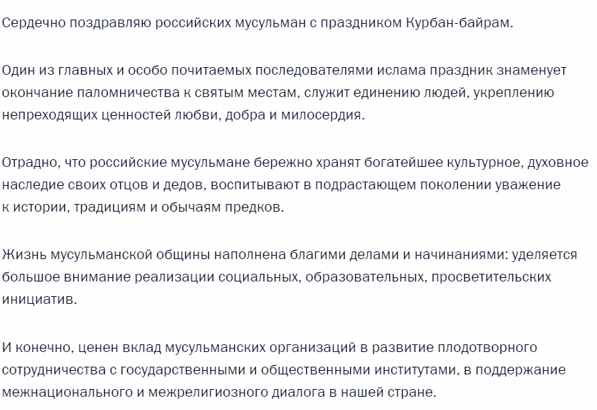 "Один из главных и особо почитаемых последователями ислама праздник знаменует окончание паломничества к святым местам, служит единению людей, укреплению непреходящих ценностей любви, добра и милосердия", - написано в обращении лидера РФ.