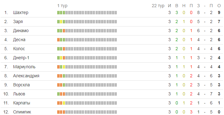 Турнирная таблица после 3 тура Премьер-лиги выглядит так