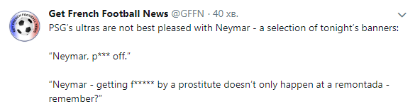 "Неймар, трахнутый проституткой, проваливай". Фанаты ПСЖ вывесили на трибунах оскорбительные банеры против своей звезды