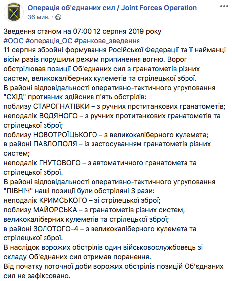 "В результате вражеских обстрелов один военнослужащий из состава Объединенных сил получил ранения", - говорится в сообщении на странице штаба в Facebook в понедельник утром.