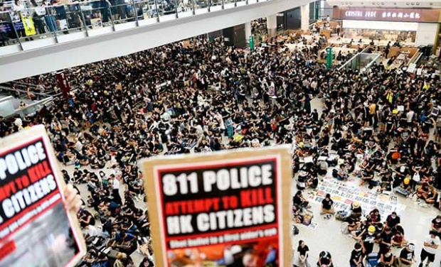 В понедельник, 12 августа, международный аэропорт Гонконга отменил все рейсы из-за того, что в главном терминале скопилось несколько тысяч протестующих. Об этом сообщает АР со ссылкой на пресс-службу воздушной гавани.