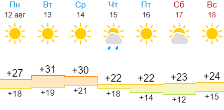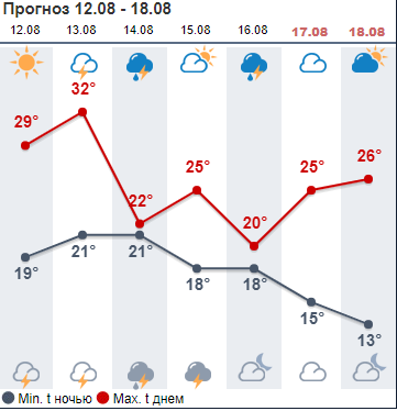 Прогноз Мeteoprog.ua показывает, что в понедельник и вторник воздух прогреется до +29...+32. 13 августа возможна гроза. В среду, 14 августа, температура днем опустится до +22, обещают грозу. Погодный ресурс обещает дождь и в пятницу, 16 августа. Погода на выходных такая: днем +25...+26, переменная облачность без осадков.