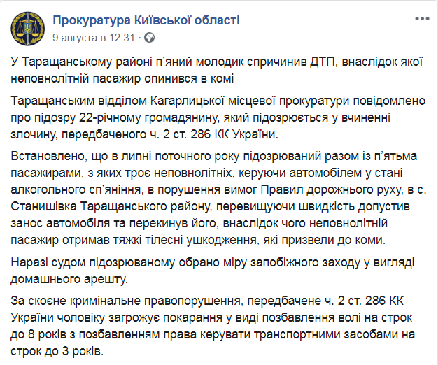 Таращанский отдел Кагарлыкской местной прокуратуры сообщил водителю о подозрении в совершении преступления, предусмотренного ч. 2 ст. 286 УК Украины. По этой статье предусмотрено наказание в виде лишения свободы на срок до 8 лет с лишением права управлять транспортными средствами на срок до 3 лет.