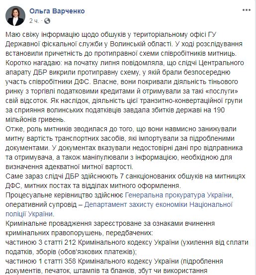 "Именно сейчас следователи ГБР осуществляют 7 санкционированных обысков на таможнях ГФС, таможенных постах и отделах таможенного оформления", - сообщила она. Варченко добавила, что во время следствия сотрудники бюро установили причастность к противоправной схеме сотрудников таможен на Волыни.