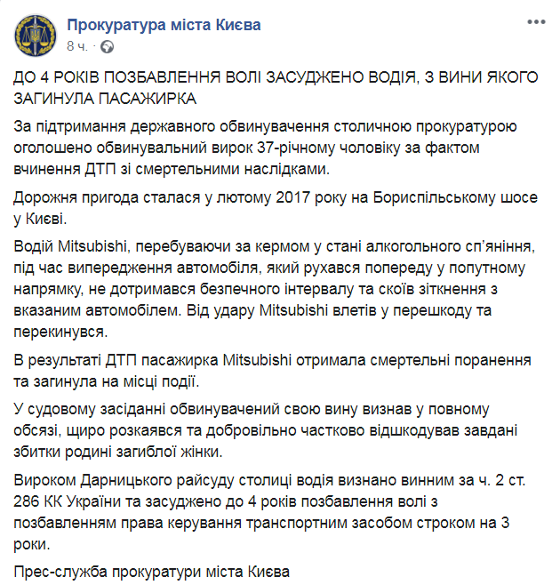 Столичная прокуратура вынесла обвинительный приговор 37-летнему мужчине, который спровоцировал ДТП со смертельным исходом. Об этом пресс-служба прокуратуры Киева сообщает на своем Facebook.
