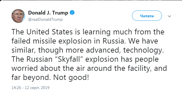 "Взрыв российской Skyfall (название крылатой ракеты неограниченной дальности с малогабаритной сверхмощной ядерной энергоустановкой "Буревестник" по классификации НАТО - Ред.) заставил людей беспокоиться о качестве воздуха в районе объекта и далеко за его пределами. Нехорошо!" - добавил Дональд Трамп.