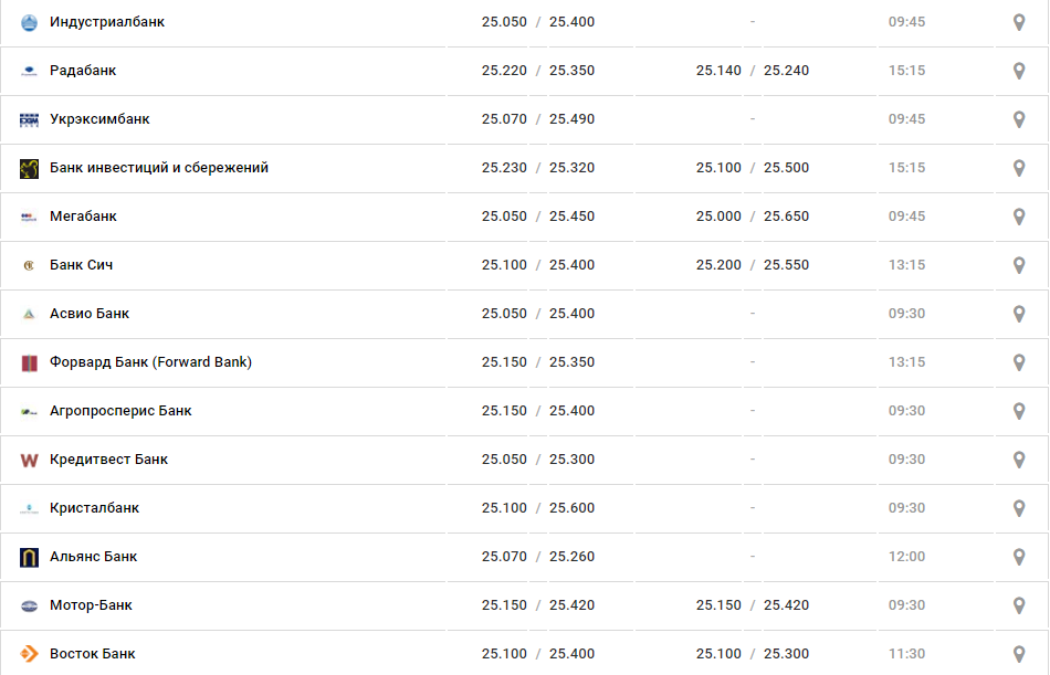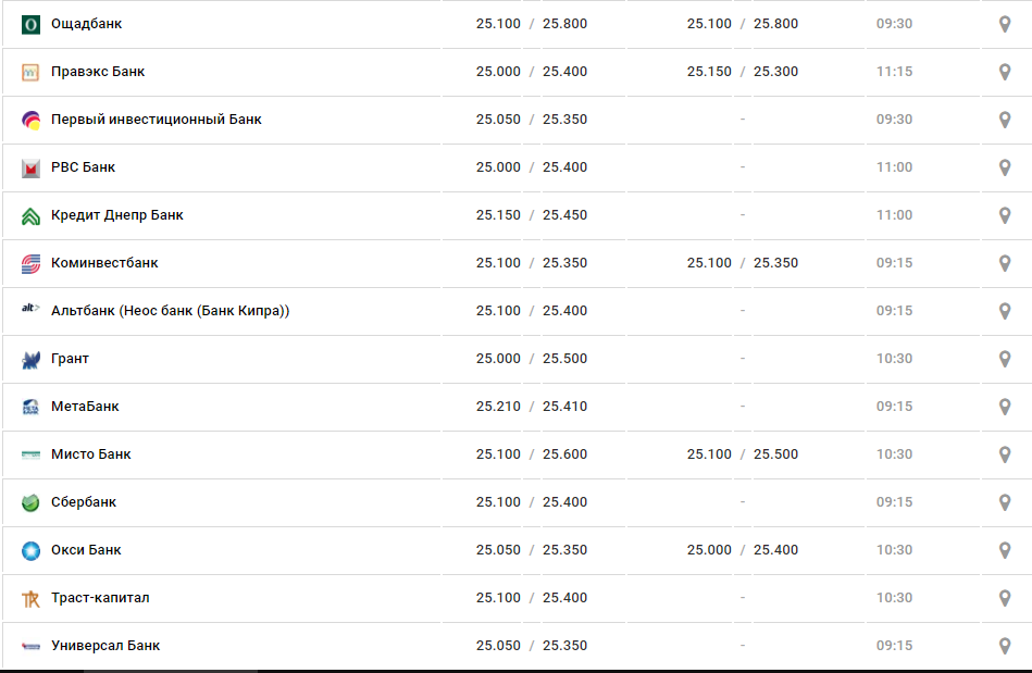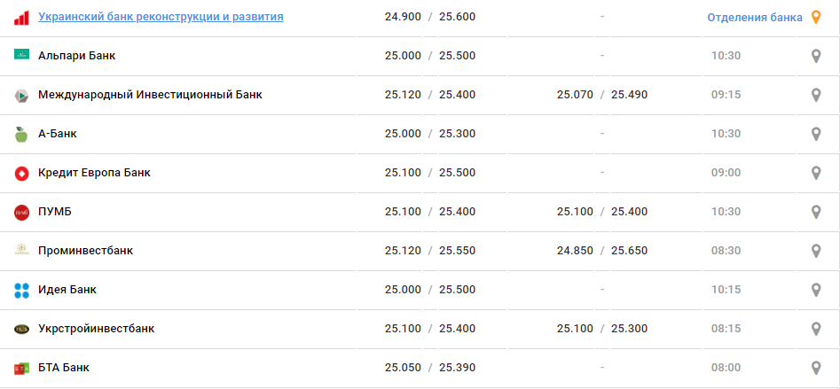 В банках курс доллара с утра был такой: покупка - от 24,8 до 25,3 грн, продажа от 25,29 до 25,8 грн. К вечеру показатели покупки/продажи составили 24,90/25,80 грн., соответственно.