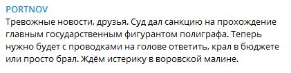 "Тревожные новости, друзья. Суд дал санкцию на прохождение главным государственным фигурантом полиграфа. Теперь нужно будет с проводками на голове ответить, крал в бюджете или просто брал. Ждём истерику в воровской малине", - написал Портнов.