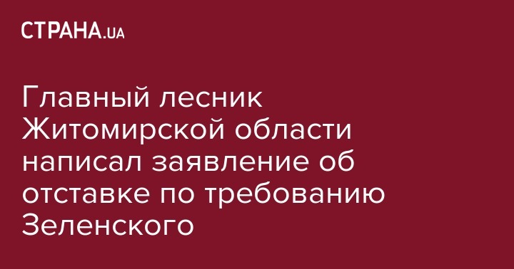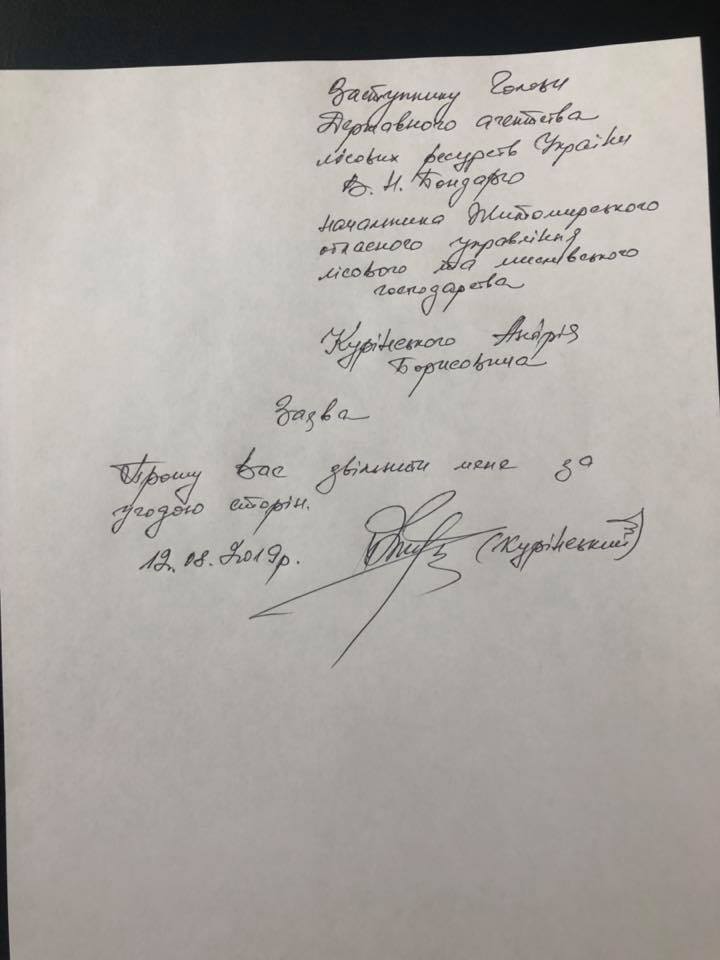 Глава Житомирского областного управления лесного и охотничьего хозяйства Андрей Куринский ушел в отставку, написав соответствующее заявление на имя заместителя председателя Государственного агентства лесных ресурсов. Документ опубликован на его странице в Facebook.