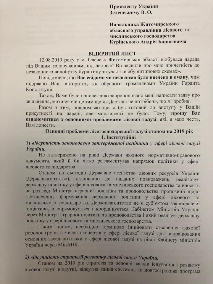 Также Куринский опубликовал открытое письмо Зеленскому, где указал, чот президент был "сознательно или бессознательно введен в заблуждение", когда тот на совещании в Олевске заявил о причастности Куринского к янтарным схемам. В письме также говорится об основных проблемах лесной отрасли области.