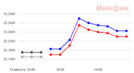 14 августа НБУ оставил курс доллара практически таким же, как вчера, 25,14 грн. В обменках доллар к обеду покупают за 25,30 грн и продают за 25,37 грн. Межбанк закрылся котировками 25,24/25,26 грн. В банках покупка-продажа была 25,1-25,4 грн. В целом курс доллара сегодня замер.
