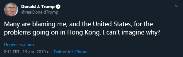 "Многие обвиняют меня и Соединенные Штаты в проблемах, происходящих в Гонконге. Я не могу представить, почему?" - удивился Дональд Трамп.