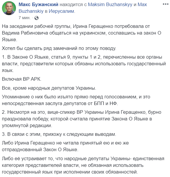 В Сети уже отреагировали на этот эпохальный спор и напомнили, что даже согласно принятому закону о тотальной украинизации народным депутатам не обязательно использовать государственный язык на заседаниях.