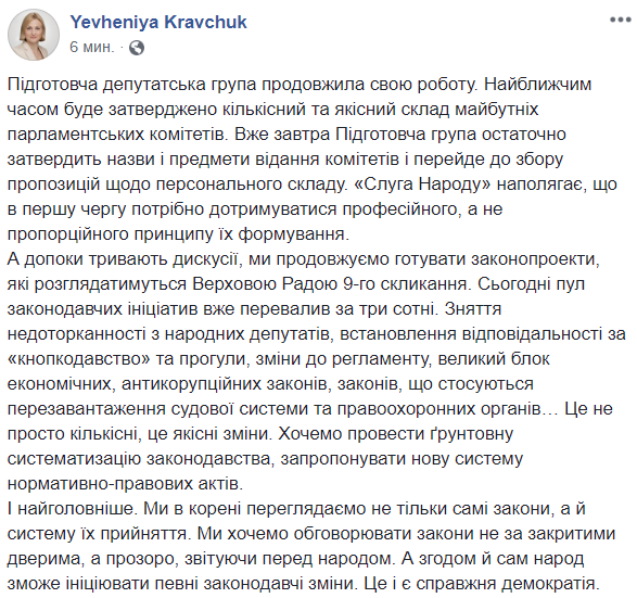 ""Слуга народа" настаивает, что в первую очередь нужно соблюдать профессиональный, а не пропорциональный принцип их (комитетов - Ред.) формирования", - заявила в Facebook глава пресс-службы партии.