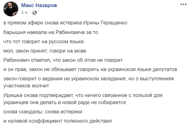 В ходе заседания произошла перепалка между Разумковым, Геращенко и Рабиновичем. Последнему сделали замечание, что он выступает на русском языке.