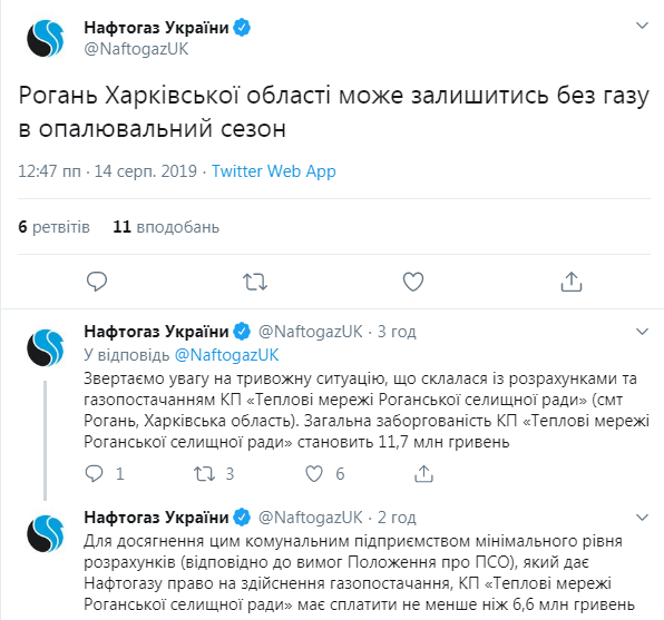 В "Нафтогазе Украины" сообщили, что посёлок городского типа Рогань в Харьковской области может остаться без газа в отопительный сезон. Об этом сообщила пресс-служба компании в твиттер-микроблоге в среду, 14 августа.