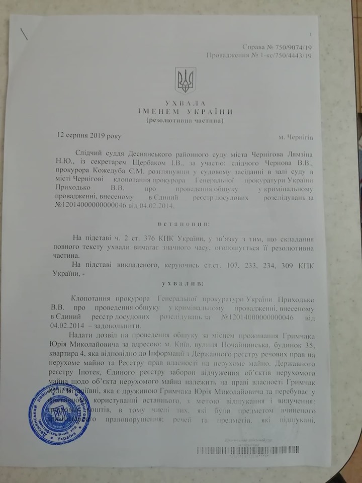 Супруга Юрия Грымчака Юлия обнародовала решение суда Чернигова, на основании которого проводились обыски. Судя по нему производство было зарегистрировано еще в 2014 году.