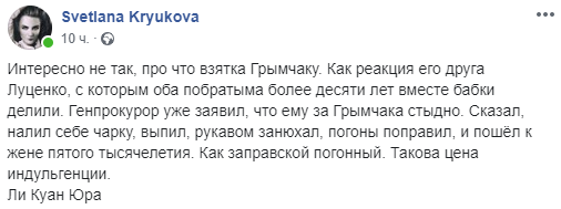 "Интересно не так, про что взятка Грымчаку. Как реакция его друга Луценко, с которым оба побратыма более десяти лет вместе бабки делили. Генпрокурор уже заявил, что ему за Грымчака стыдно. Сказал, налил себе чарку, выпил, рукавом занюхал, погоны поправил, и пошёл к жене пятого тысячелетия. Как заправской погонный. Такова цена индульгенции.