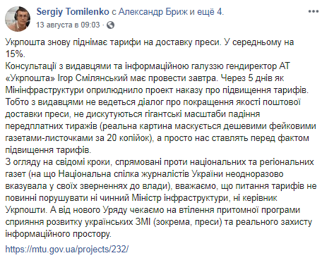 "С издателями не ведется диалог об улучшении качества почтовой доставки прессы, не дискутируются гигантские масштабы падения подписных тиражей (реальная картина маскируется дешевыми фейковыми газетами-листочками за 20 коп.) - нас просто ставят перед фактом повышения тарифов", - написал Томиленко.