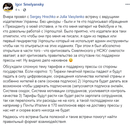 В то же время глава "Укрпочты" Игорь Смелянский в Facebook сообщил о состоявшейся в среду встрече с украинскими издателями.