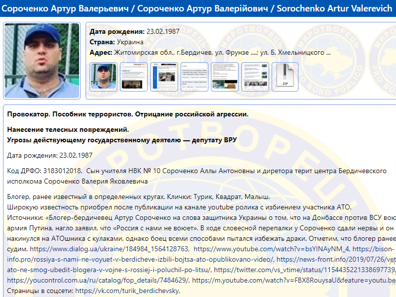 Однако после этого сайт "Миротворец" все равно занес Сороченко в свою базу данных, попросив полицию рассматривать это, как заявление о нанесении телесных повреждений и преступлении против нацбезопасности.